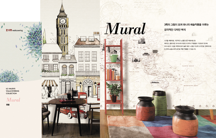 뮤럴벽지 그림벽화라는 뜻의 뮤럴벽지는 벽면 크기에 맞춰 하나의 그림을 인쇄한 벽지다. 일반 벽지는 너비 1m짜리를 이어 붙이기 때문에 무늬가 반복되는데, 뮤럴벽지는 맞춤주문제작으로 이미지가 반복되지 않는다. 그림에 따라 가격이 달라지지만, 대개 m당 8만원 정도다.